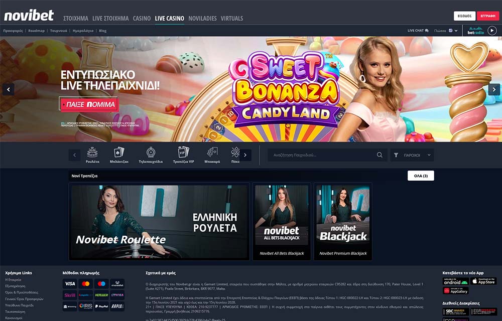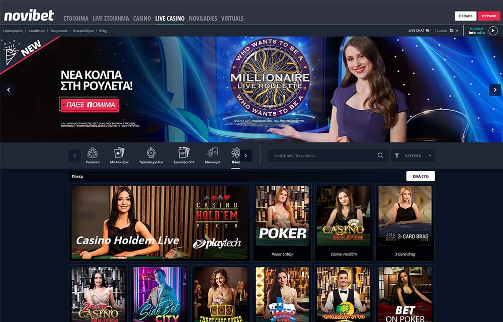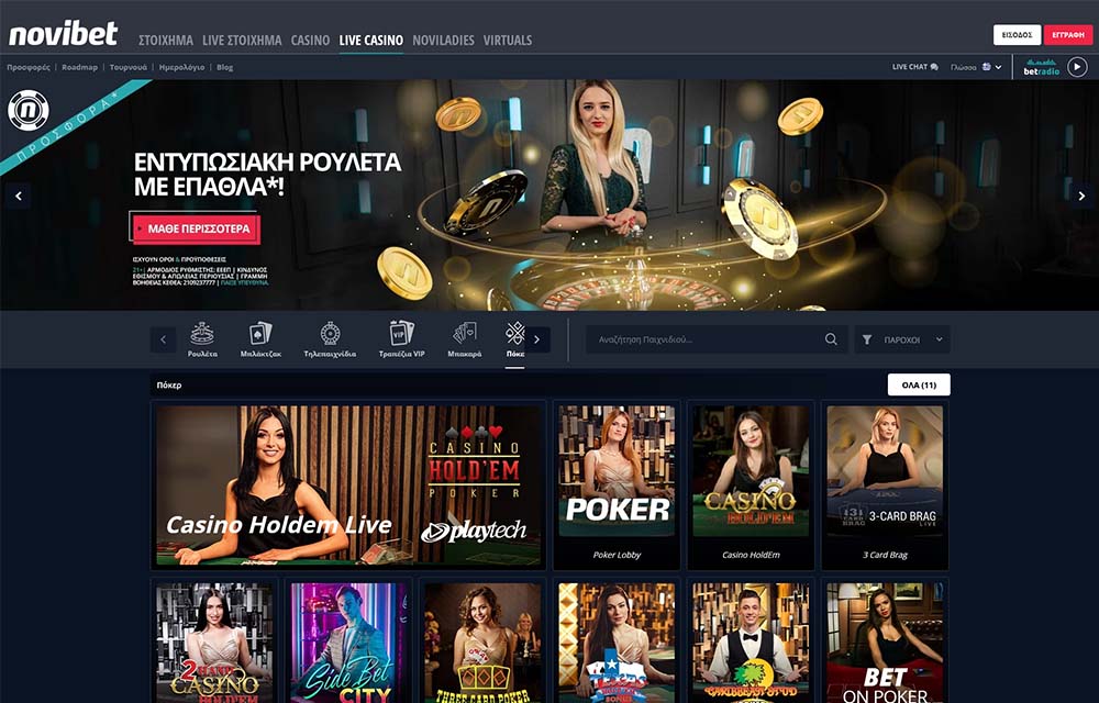 Η Novibet είναι ανάμεσα στα κορυφαία καζίνο της Ελλάδας όσον αφορά τη live δράση. Τα περισσότερα από τα παιχνίδια casino με live κρουπιέρη είναι πλέον διαθέσιμα και για φορητές συσκευές, συμπεριλαμβανομένων των London Roulette Live, Double Ball Roulette, Immersive Roulette, Dream Catcher Live, Live Μπλάκτζακ, Live Μπακαρά και πολλών άλλων!